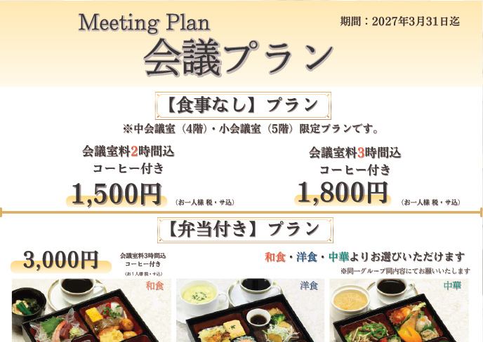 【食事なし】プラン おひとり様/1,500~1,800円(税込) 【弁当付き】プラン おひとり様/3,000~4,000円(税込) |