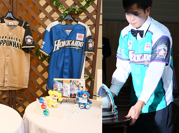試合観戦の度に集まるユニフォームコレクション。お二人を知ってもらう為、楽しい雰囲気を味わってもらう為にスタッフがユニフォーム着させていただきました(担当者談)